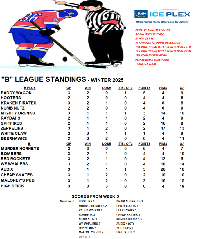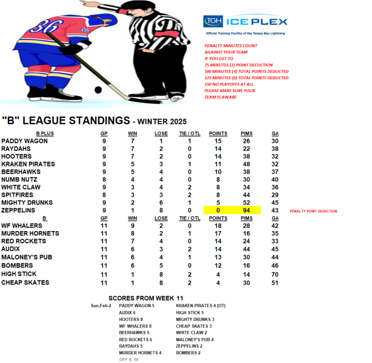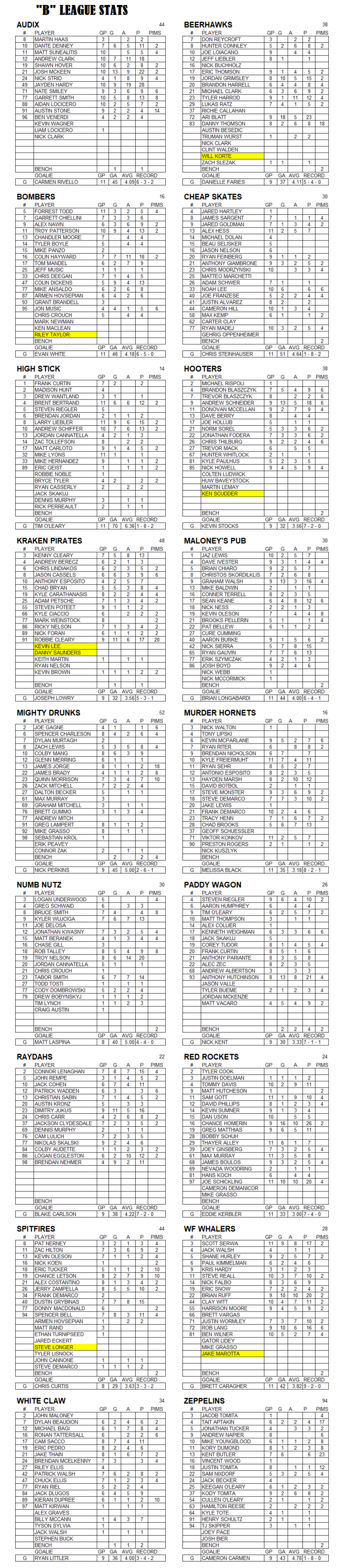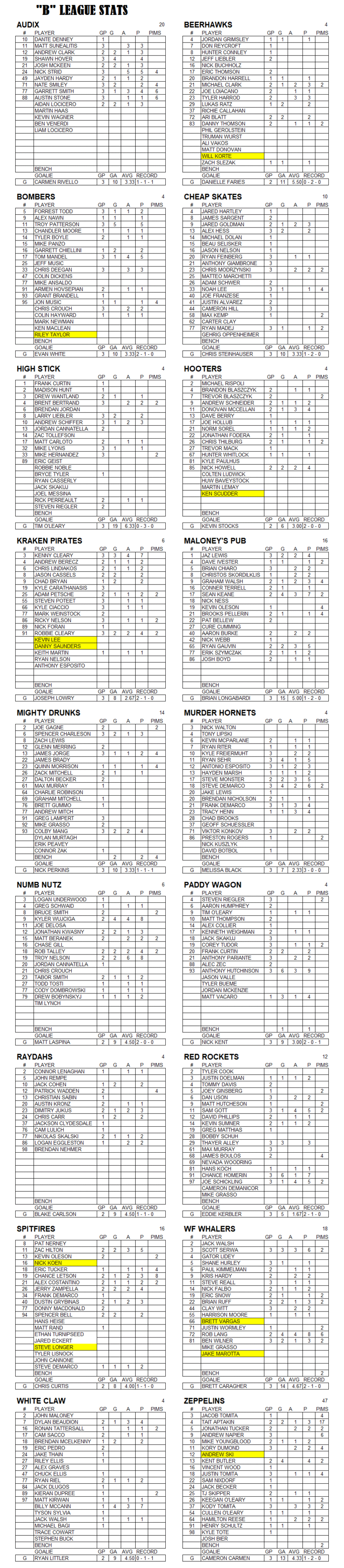 The B-League is broken up into three levels like the C-League but touts a more competitive skill level. Games are played Monday and Tuesday nights beginning at 7:00pm.  Current schedules, standings, and statistics can be seen below.