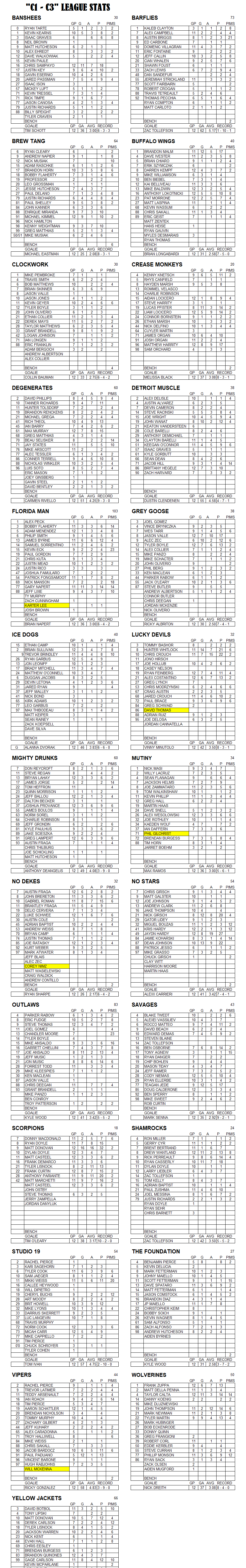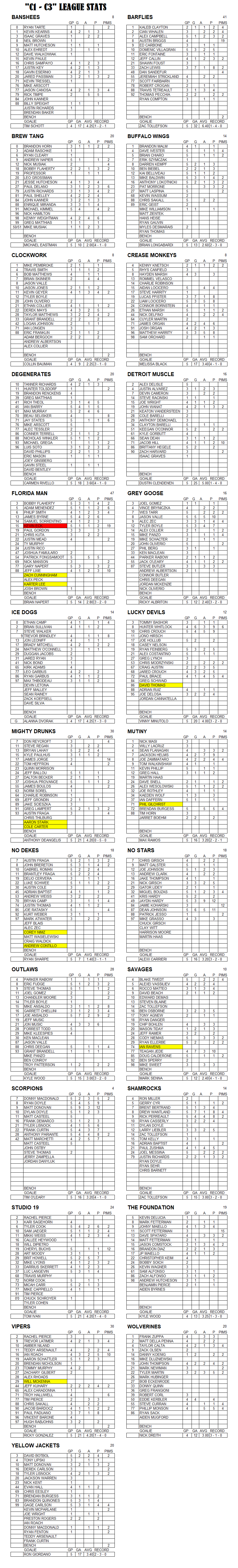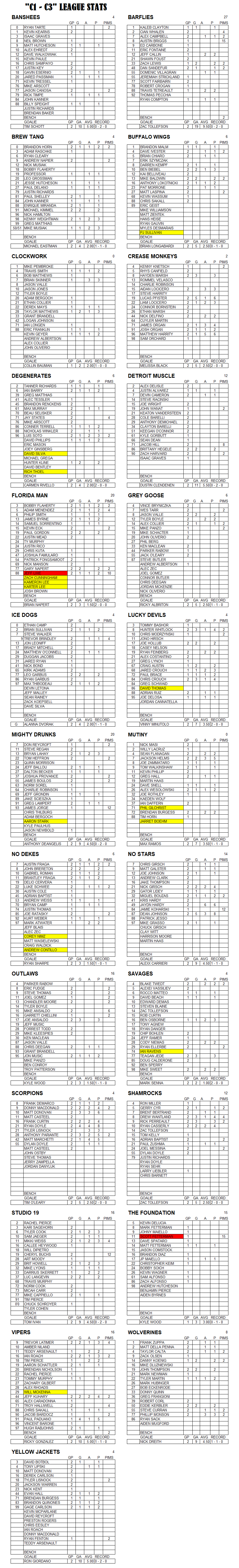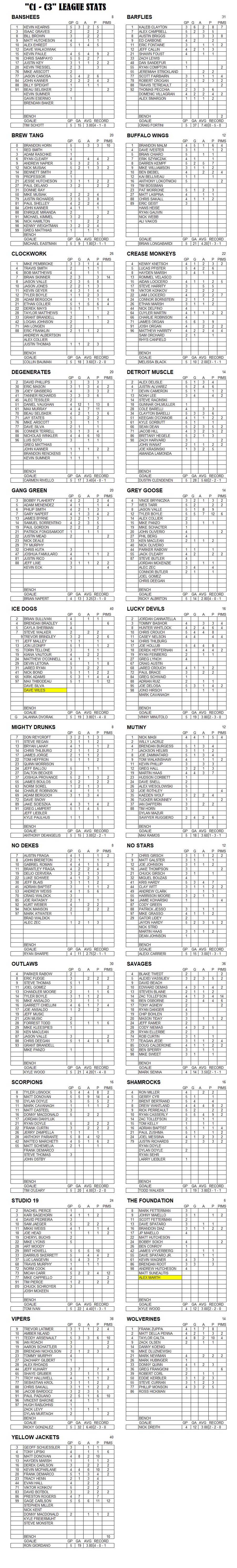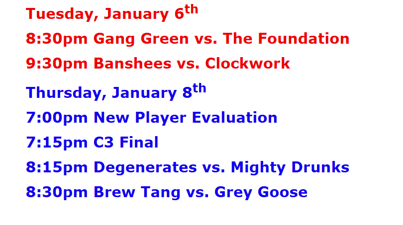 C-League The C-League has three levels of moderate skill level players. Games are played Tuesday through Friday nights beginning at 7:00pm. For current schedules, standings, and statistics see below.