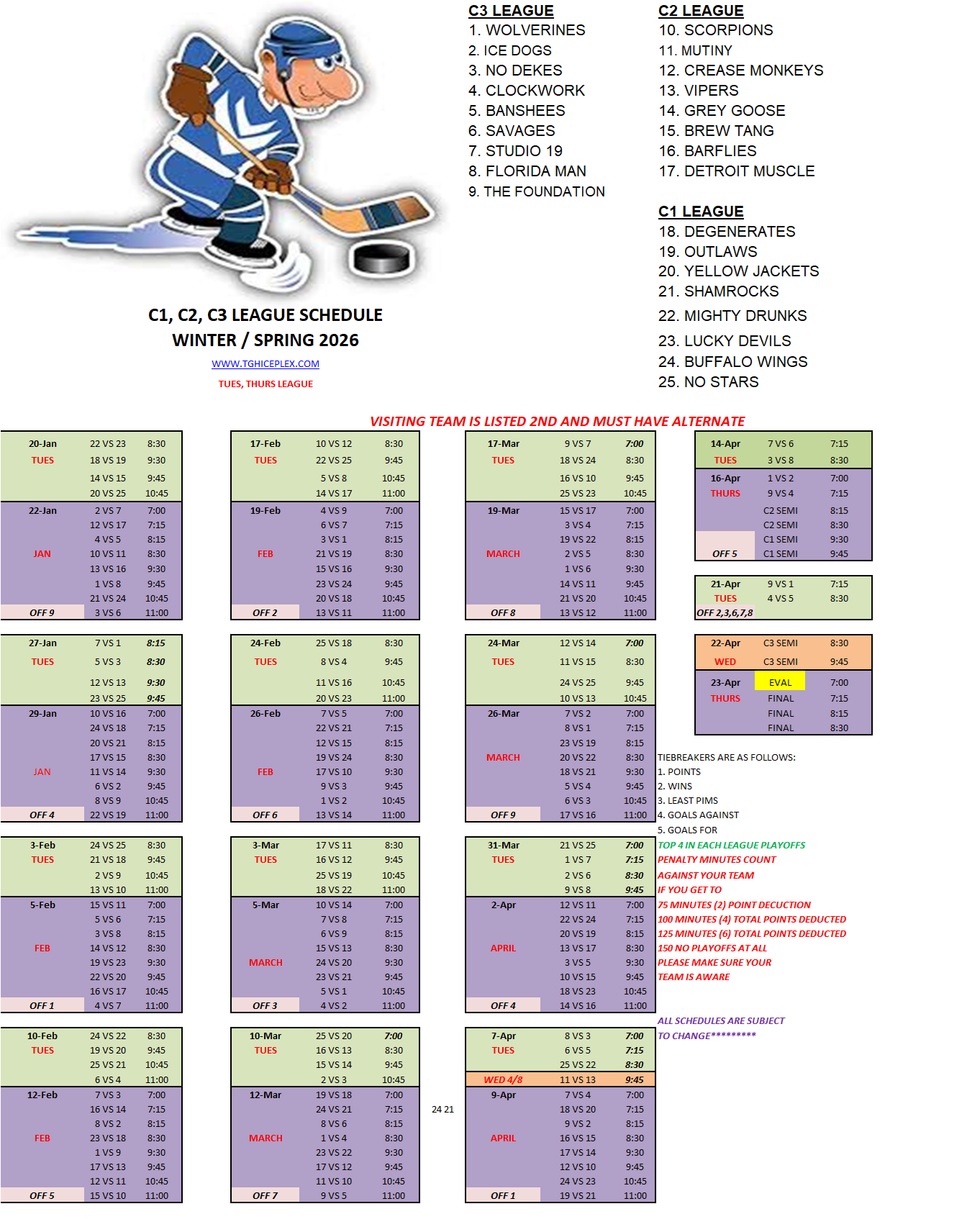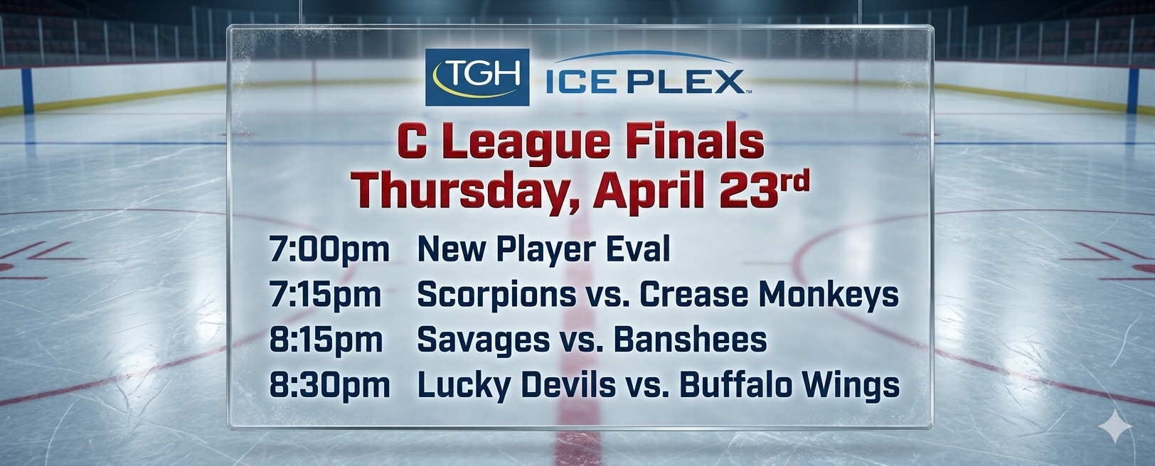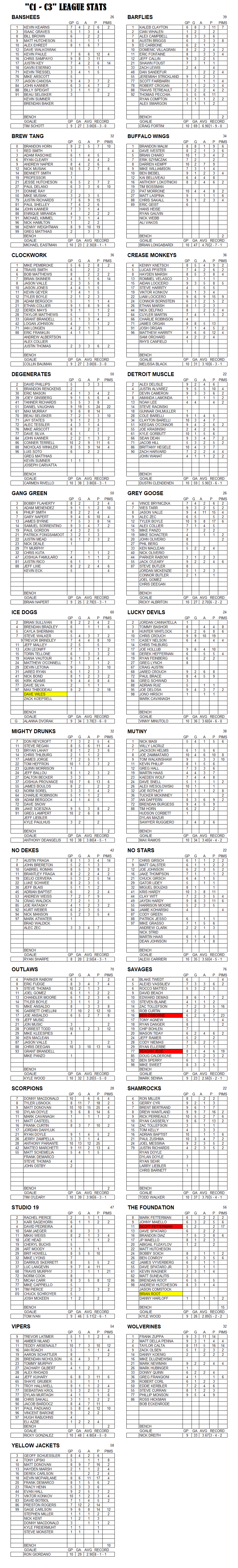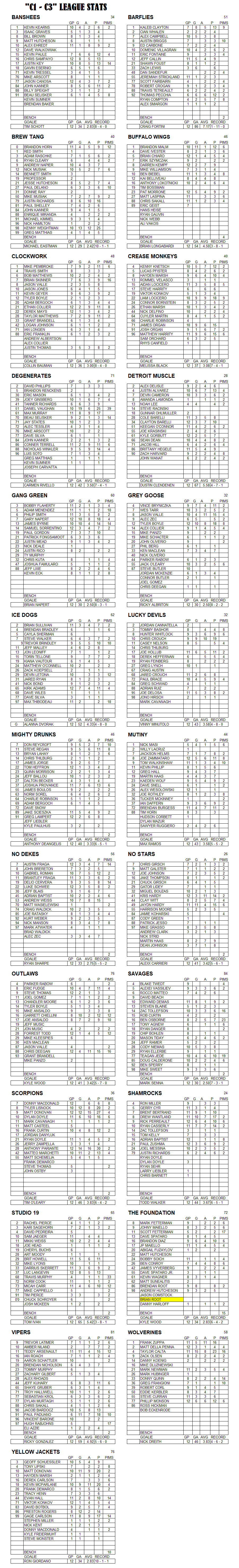 C-League The C-League has three levels of moderate skill level players. Games are played Tuesday through Friday nights beginning at 7:00pm. For current schedules, standings, and statistics see below.