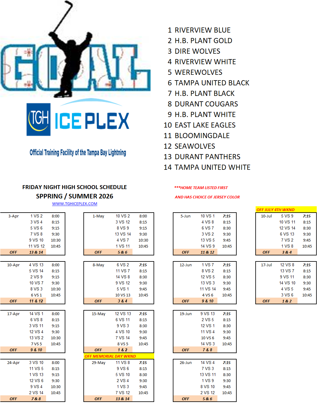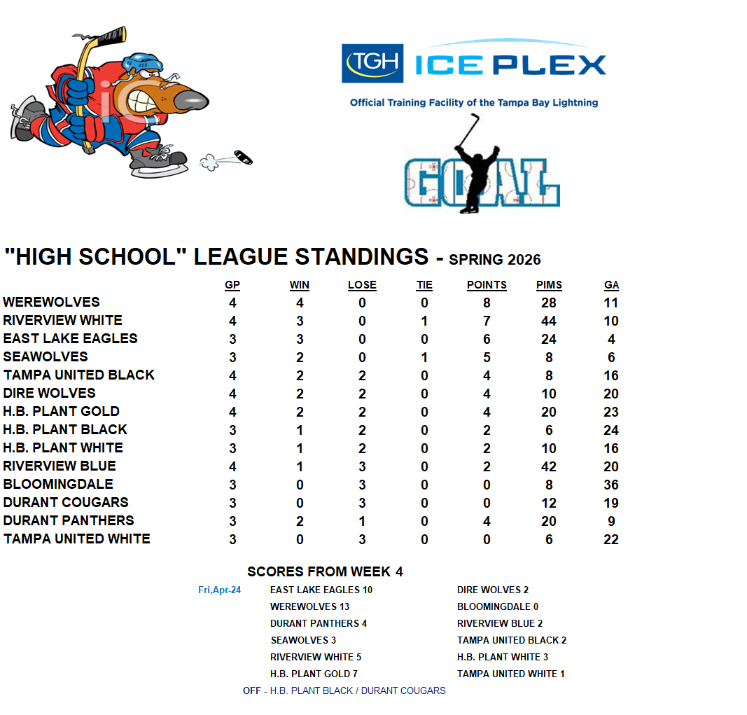 For the Fall Season:Ice Sports Forum hosts games and practices for teams in the Lightning High School Hockey League. Click here for the LHSHL website. For the Spring Season:Ice Sports Forum will be running a Spring High School Hockey League.