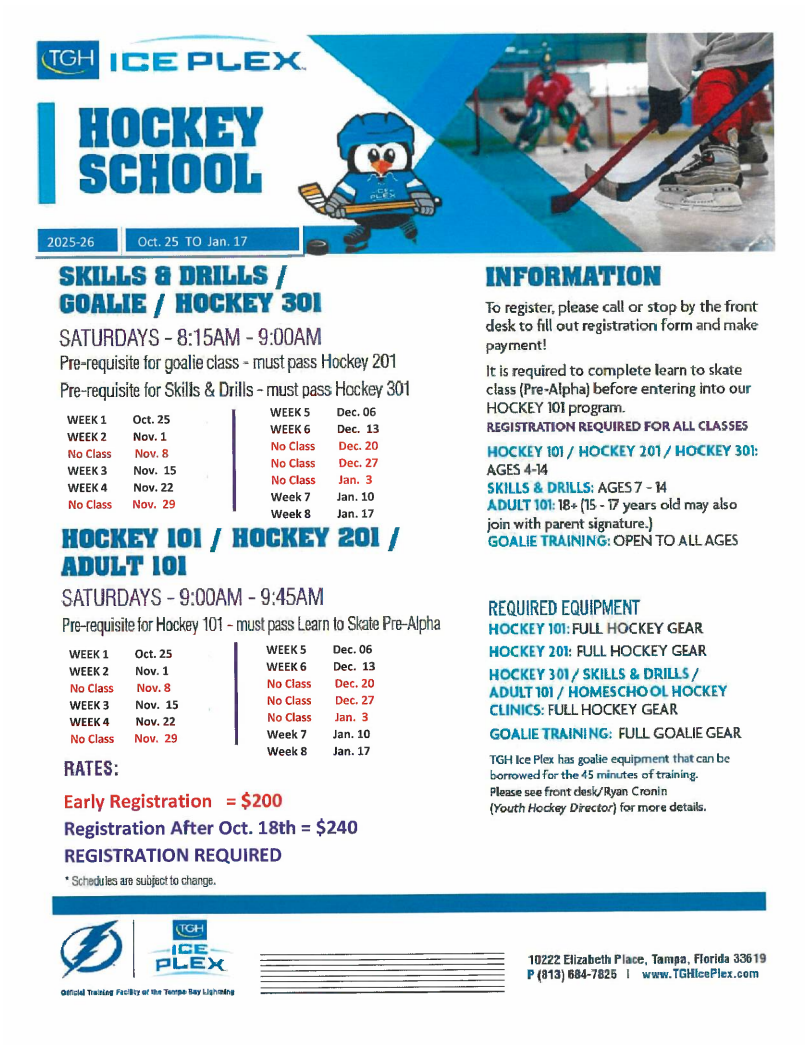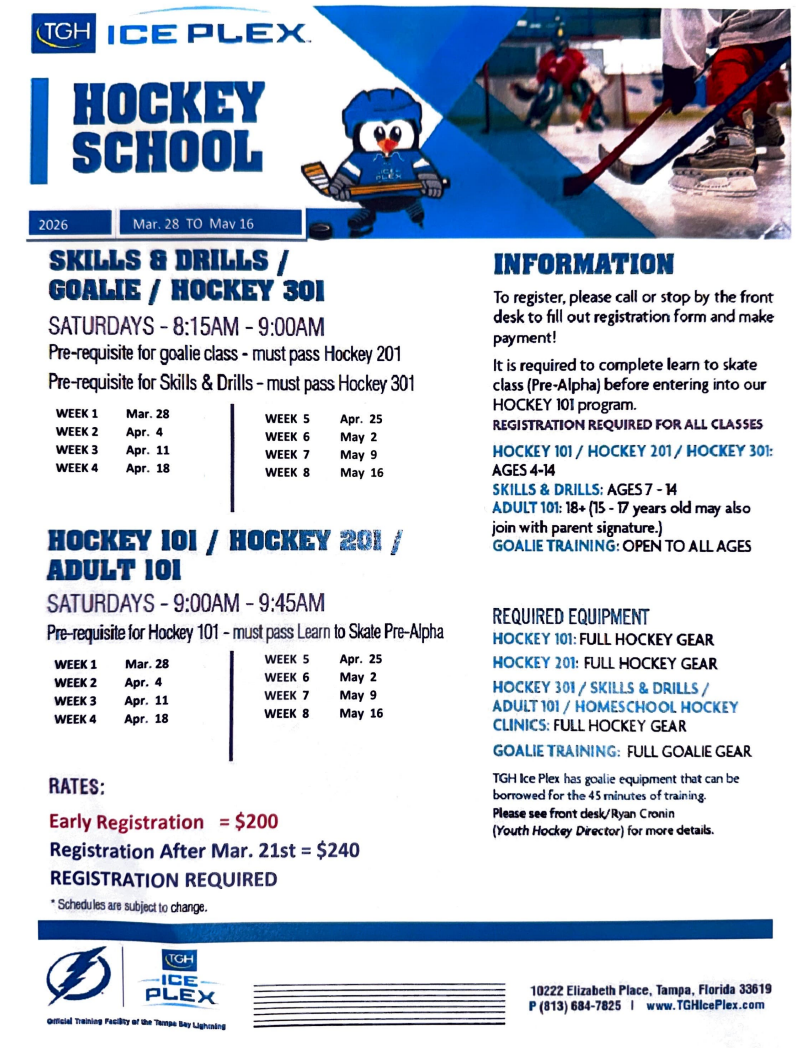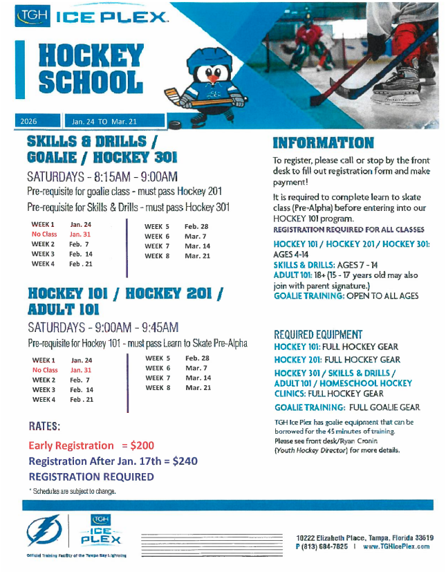 – Prerequisite: Must pass the Intro to Hockey program and/or already be playing in the Mites/Rec League at TGH Ice Plex