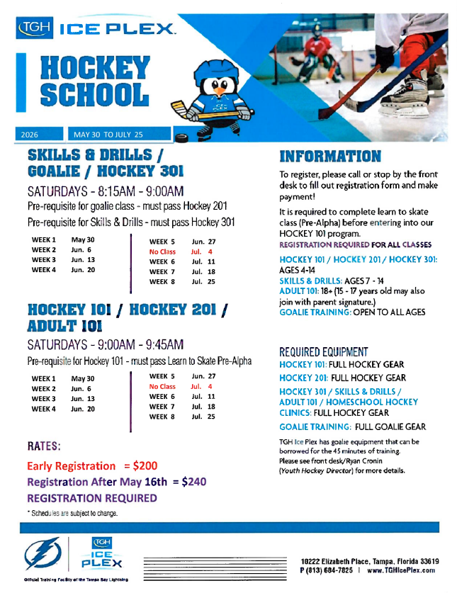 i. New youth goalies looking to try out the goalie position are able to borrow goalie equipment for the 45 minute class! Please see front desk/Ryan Cronin (Youth Hockey Director) for more details