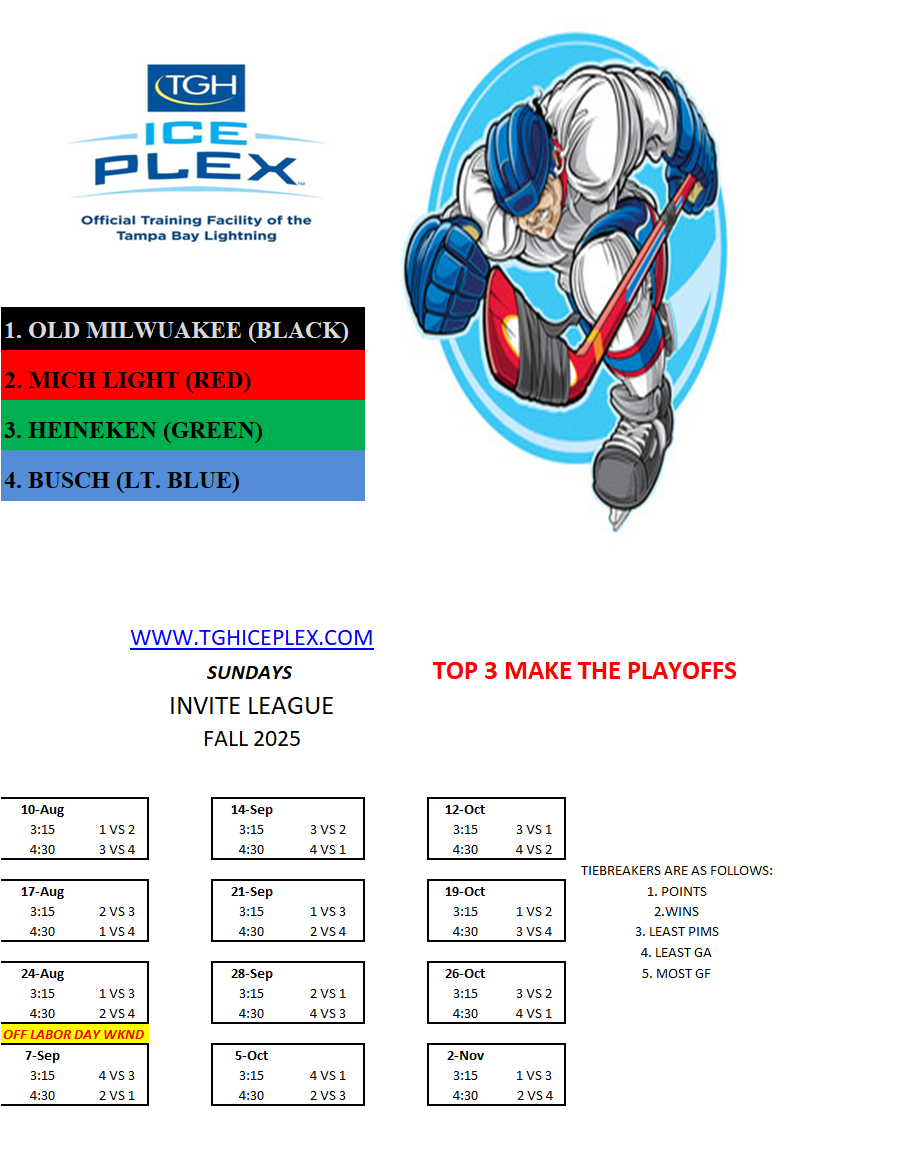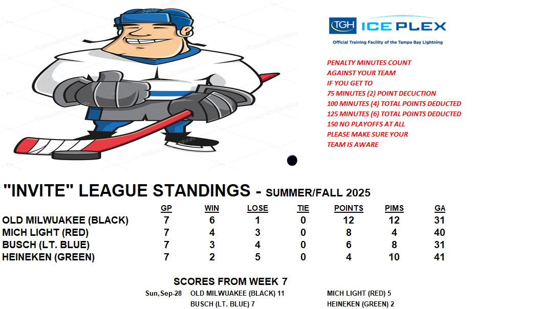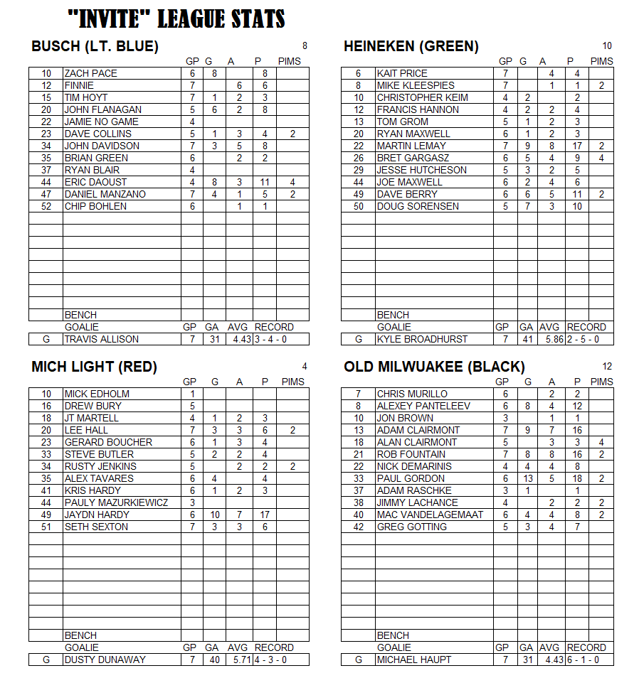 The Invite League is a more casual league with a mixed bag of skill levels.  Games play on Sunday from 3:15pm to 4:30pm. Current schedule, standings, and statistics are below.