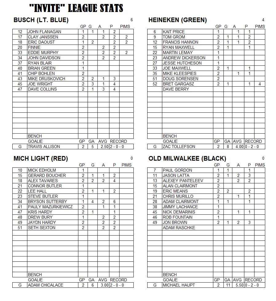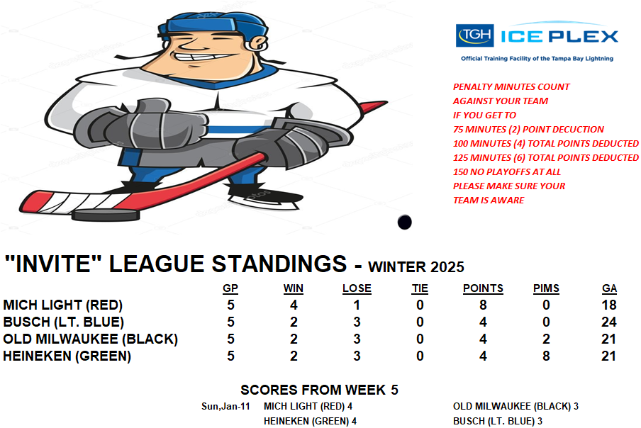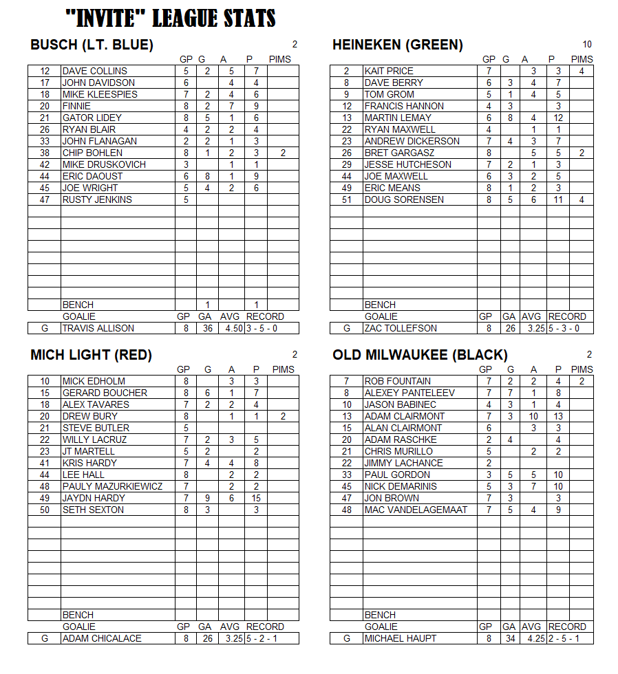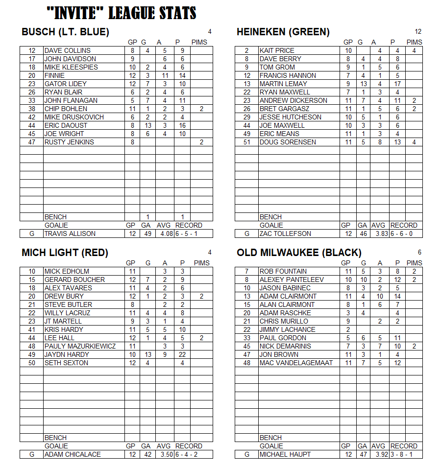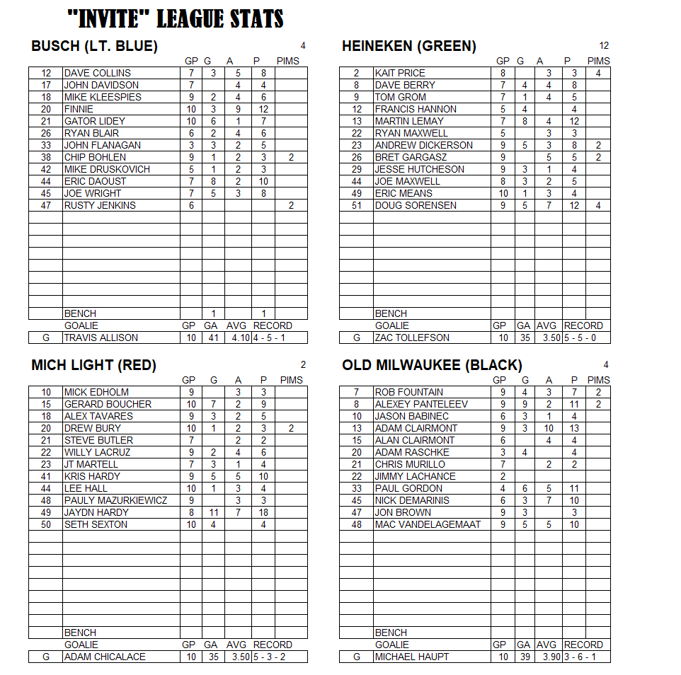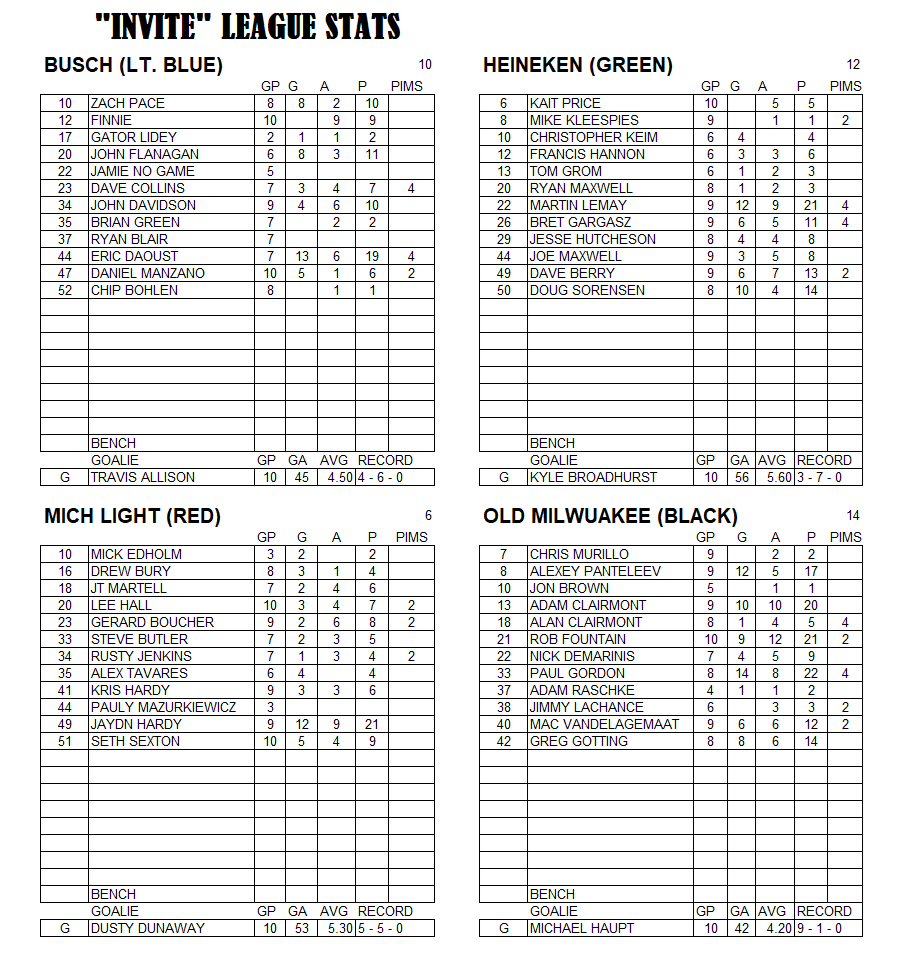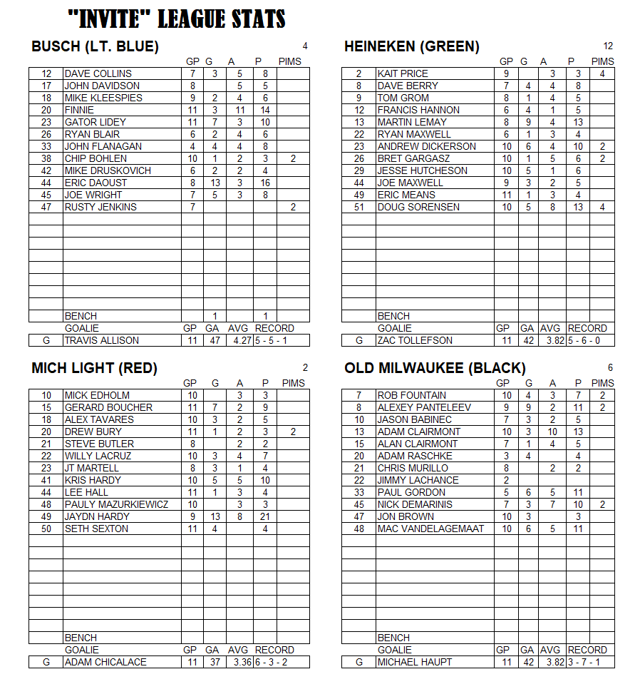 Invite League The Invite League is a more casual league with a mixed bag of skill levels. Games play on Sunday from 3:15pm to 4:30pm. Current schedule, standings, and statistics are below.