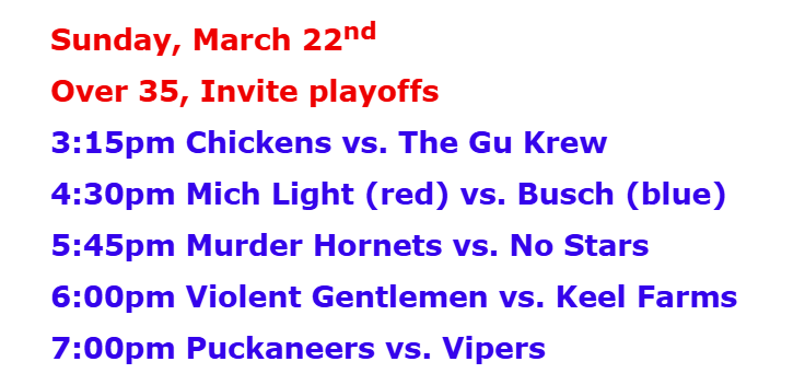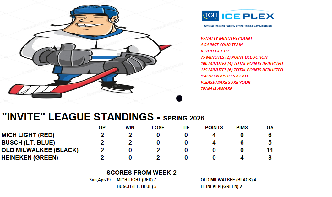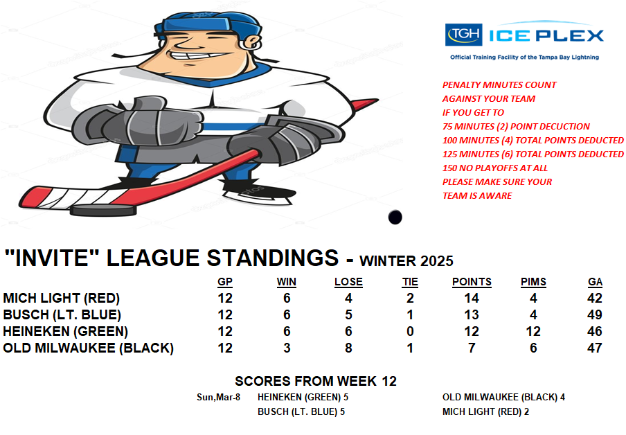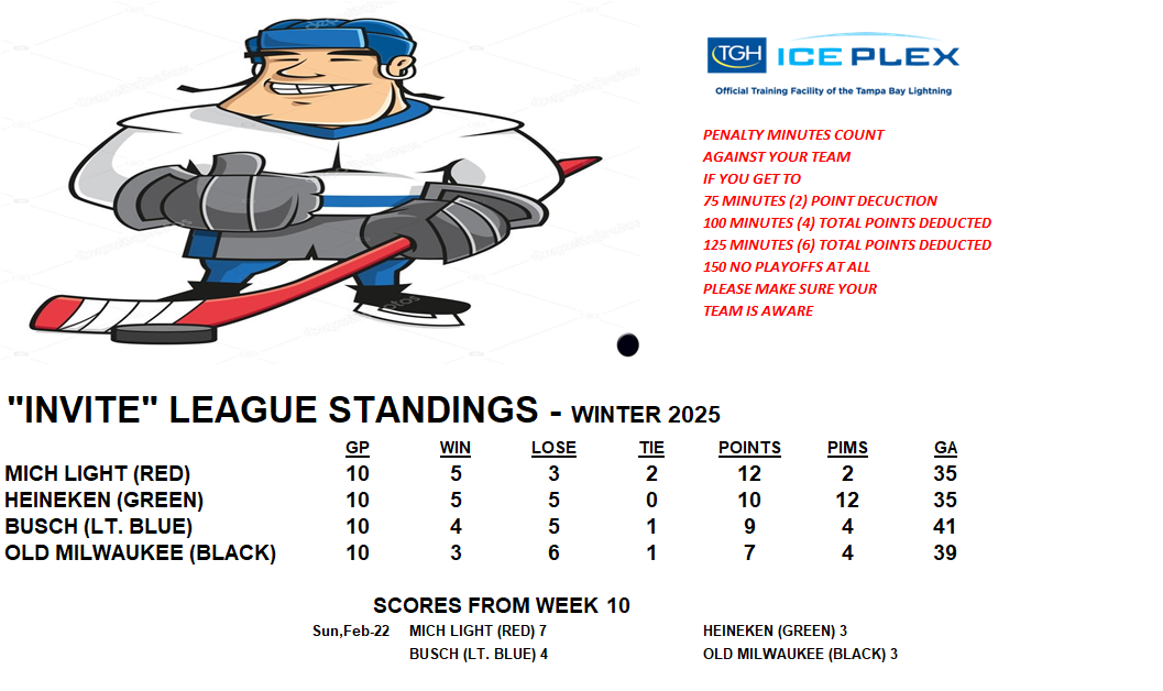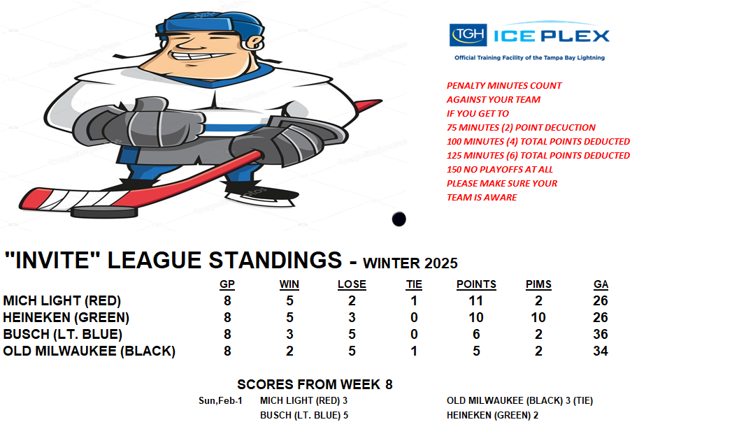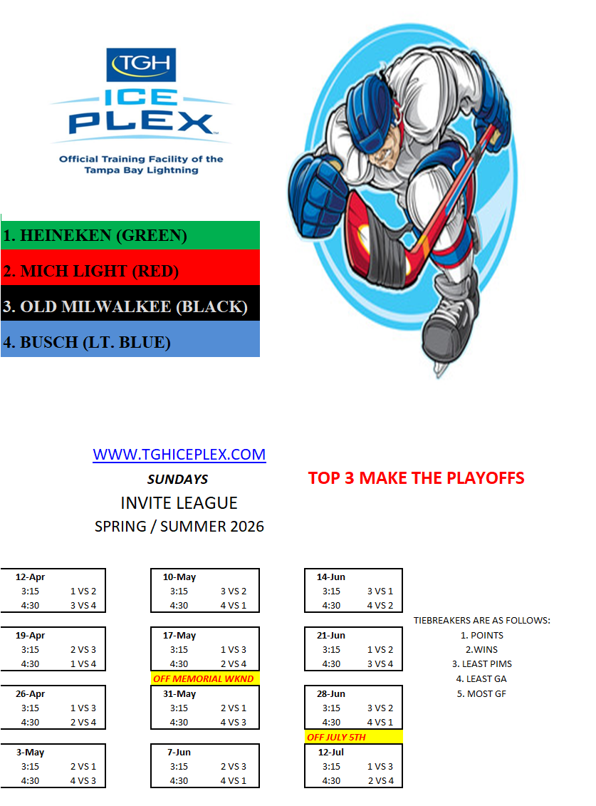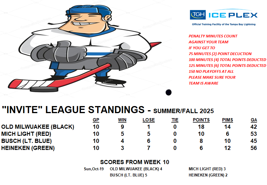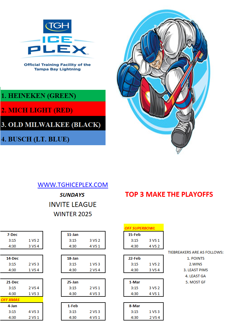 Invite League The Invite League is a more casual league with a mixed bag of skill levels. Games play on Sunday from 3:15pm to 4:30pm. Current schedule, standings, and statistics are below.
