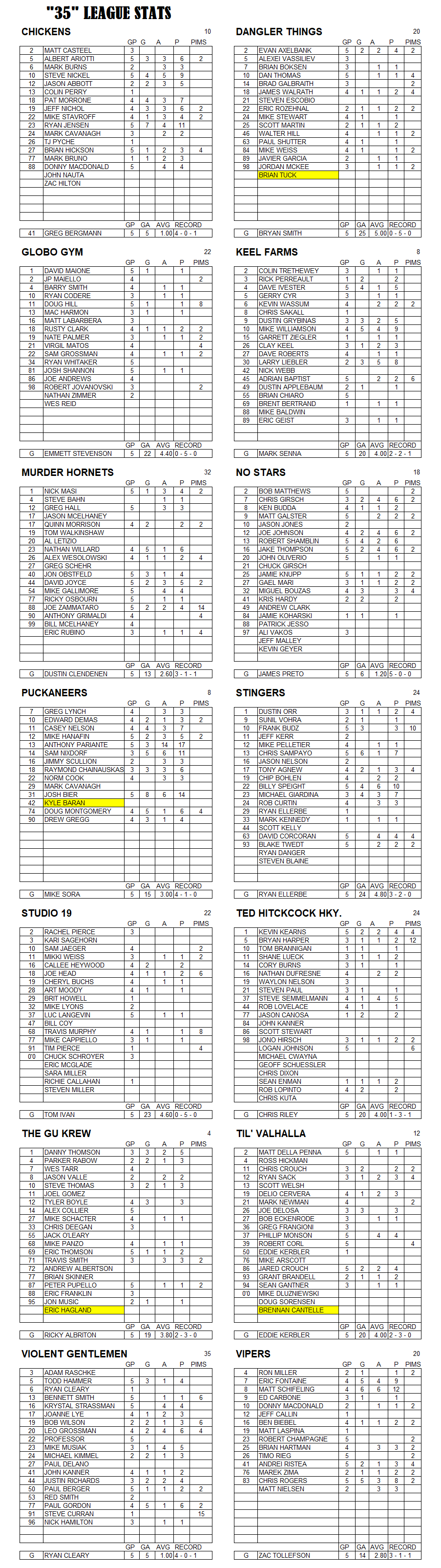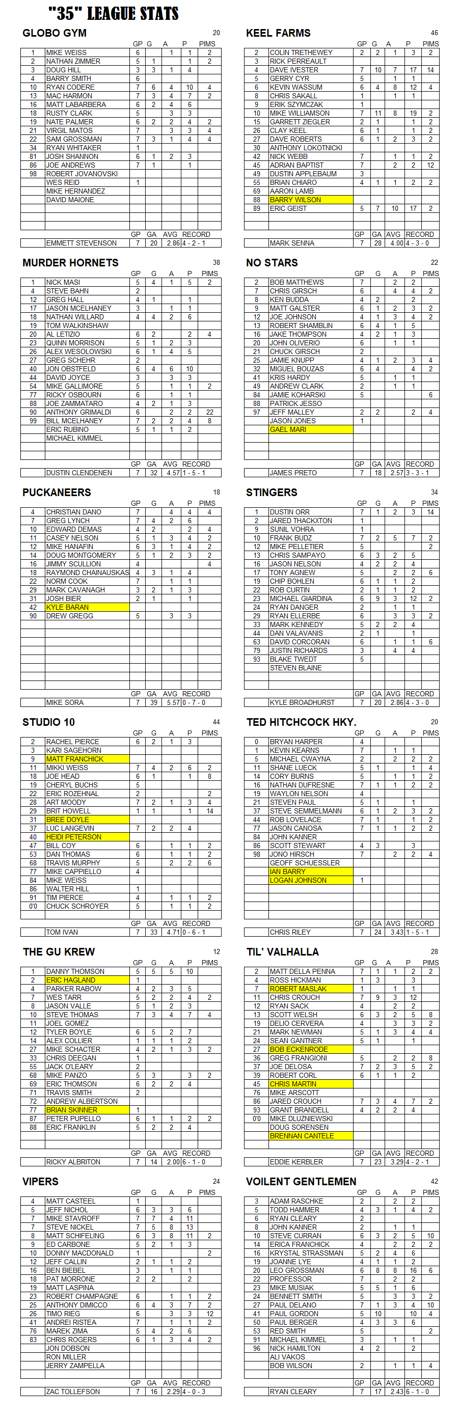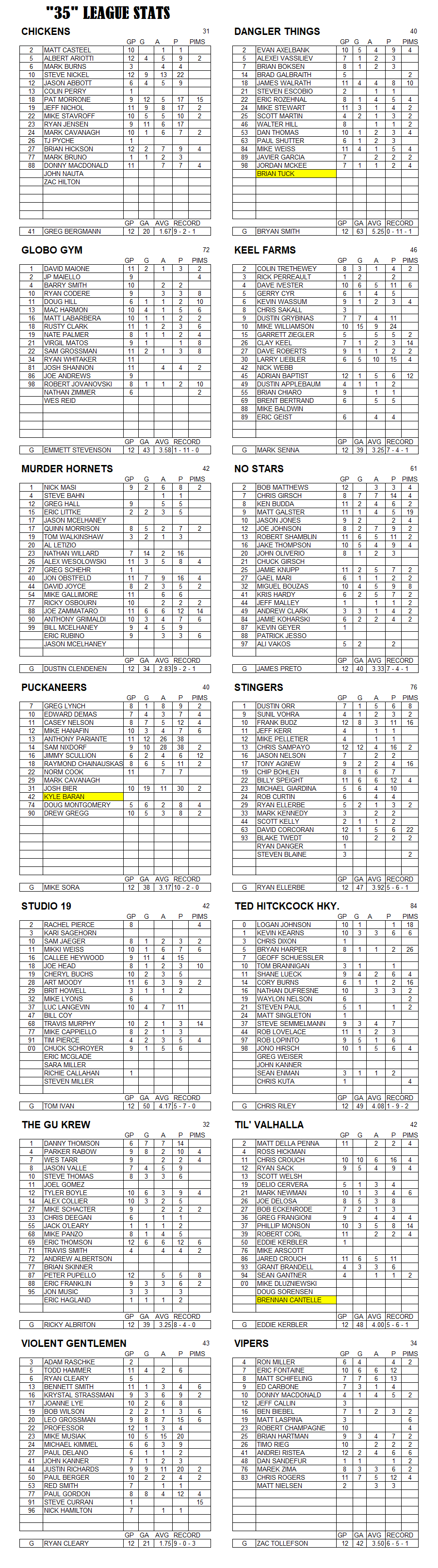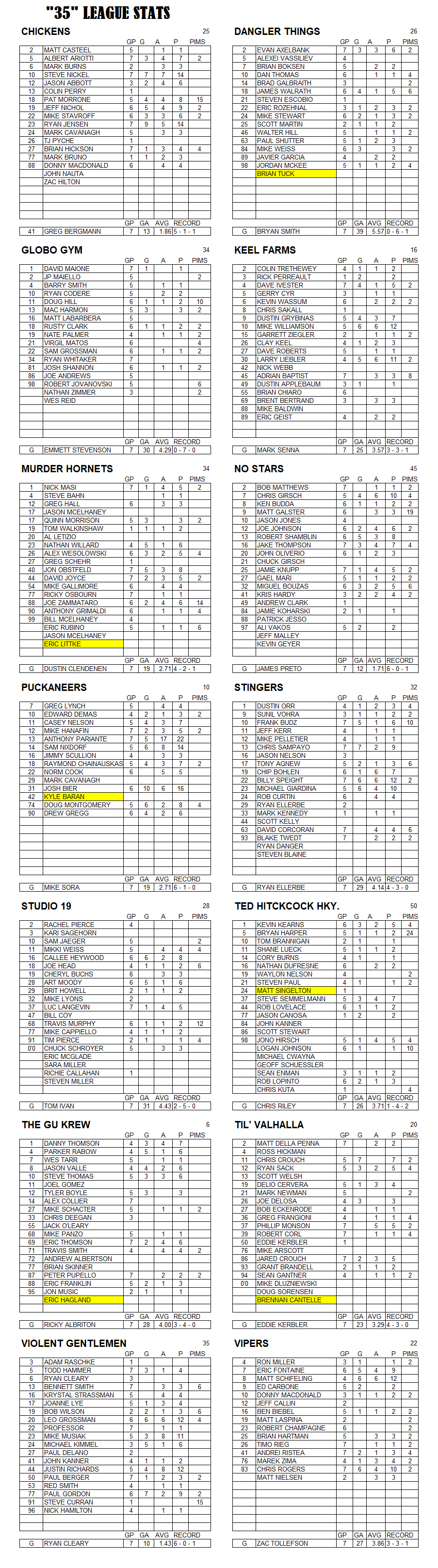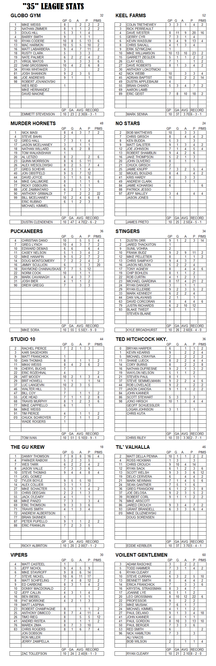 Over 35 League The Over 35 League has a general mix of C level players. Games are played Sunday evenings beginning at 5:45pm. For current schedules, standings, and statistics see below.