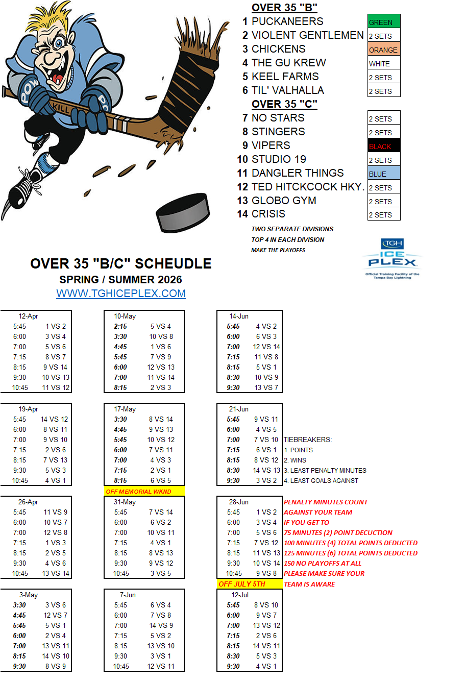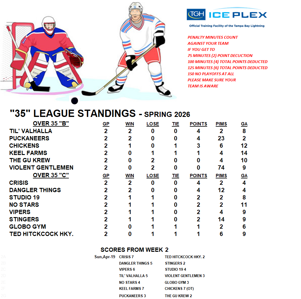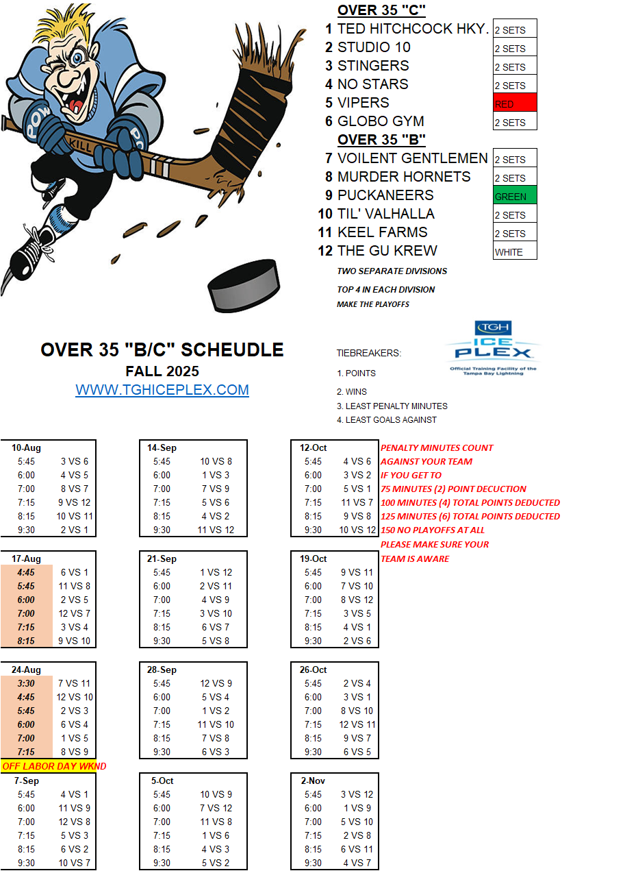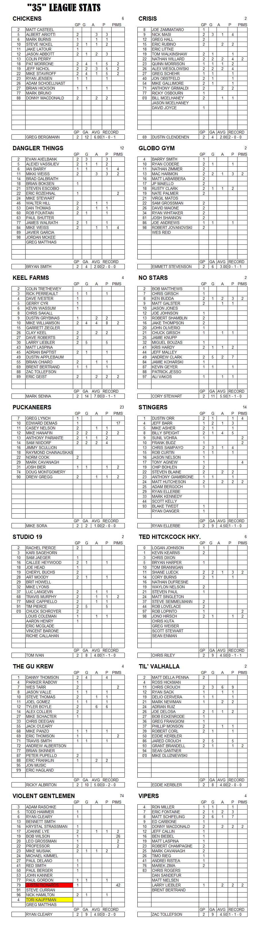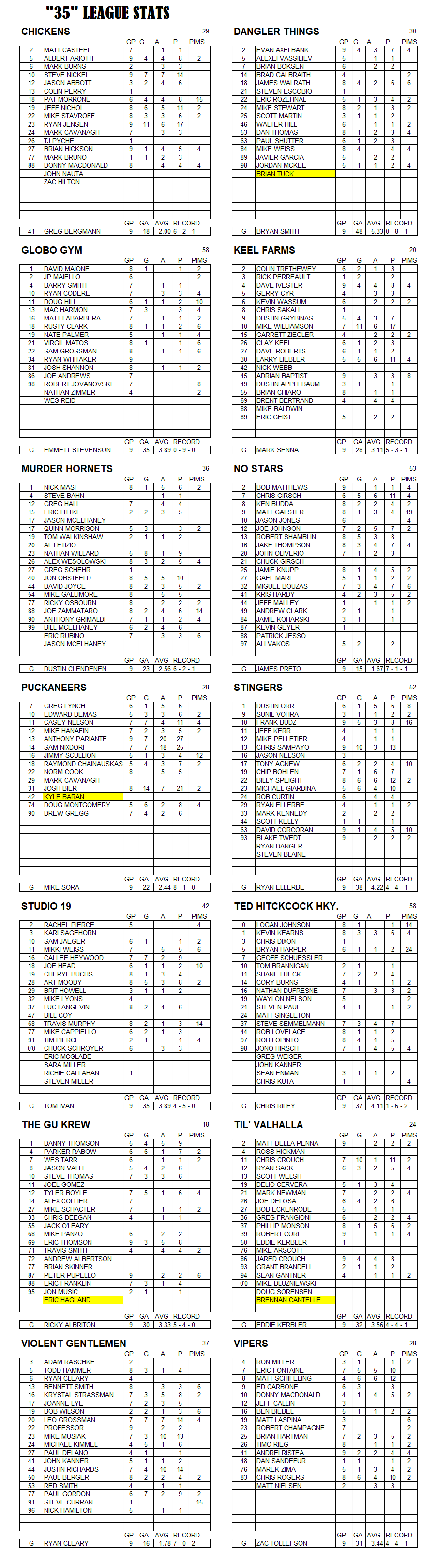 Over 35 League The Over 35 League has a general mix of C level players. Games are played Sunday evenings beginning at 5:45pm. For current schedules, standings, and statistics see below.