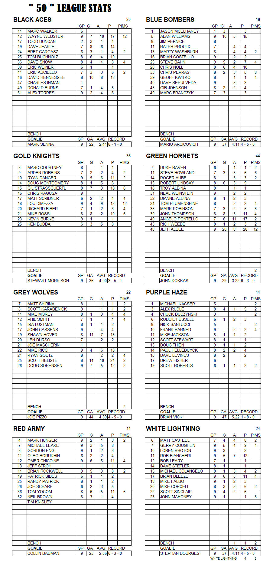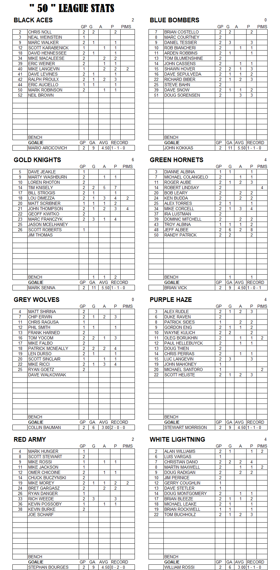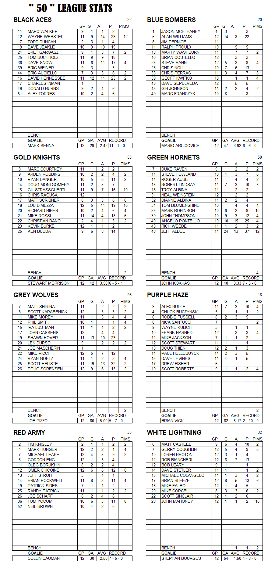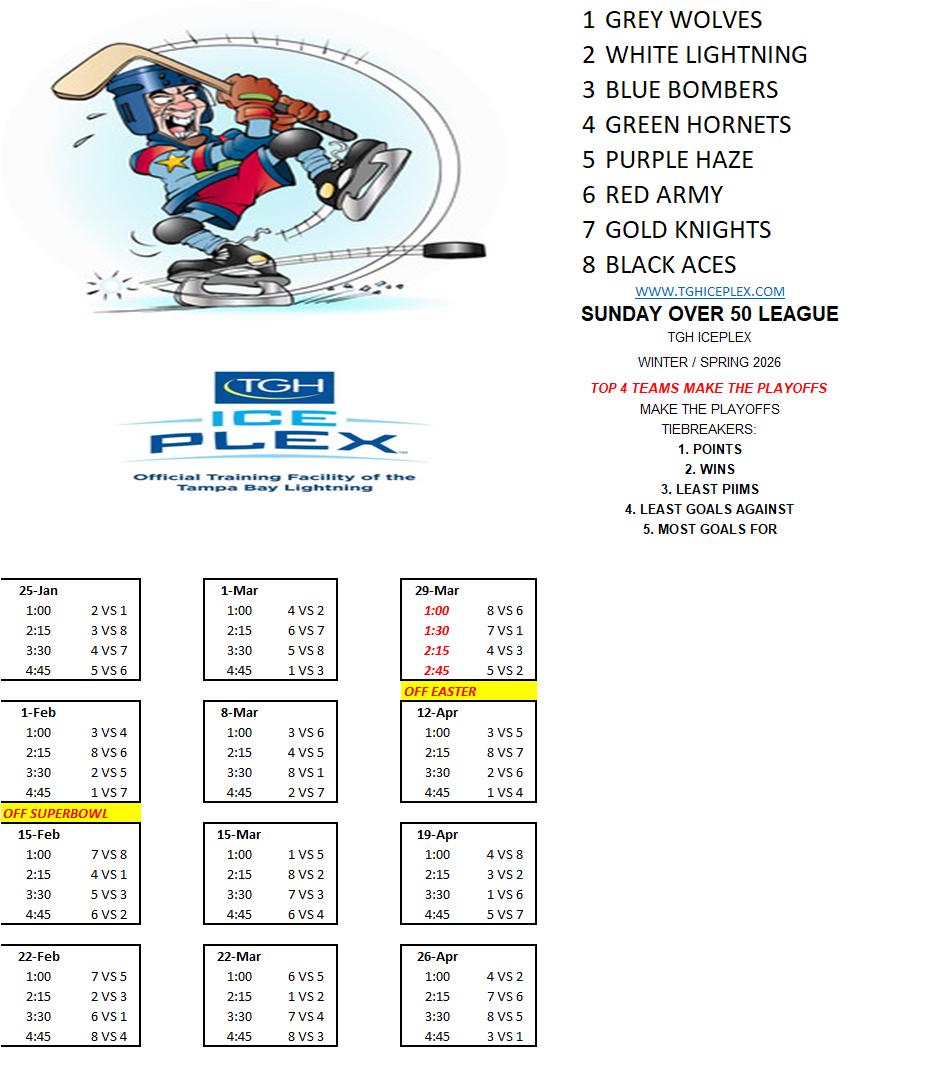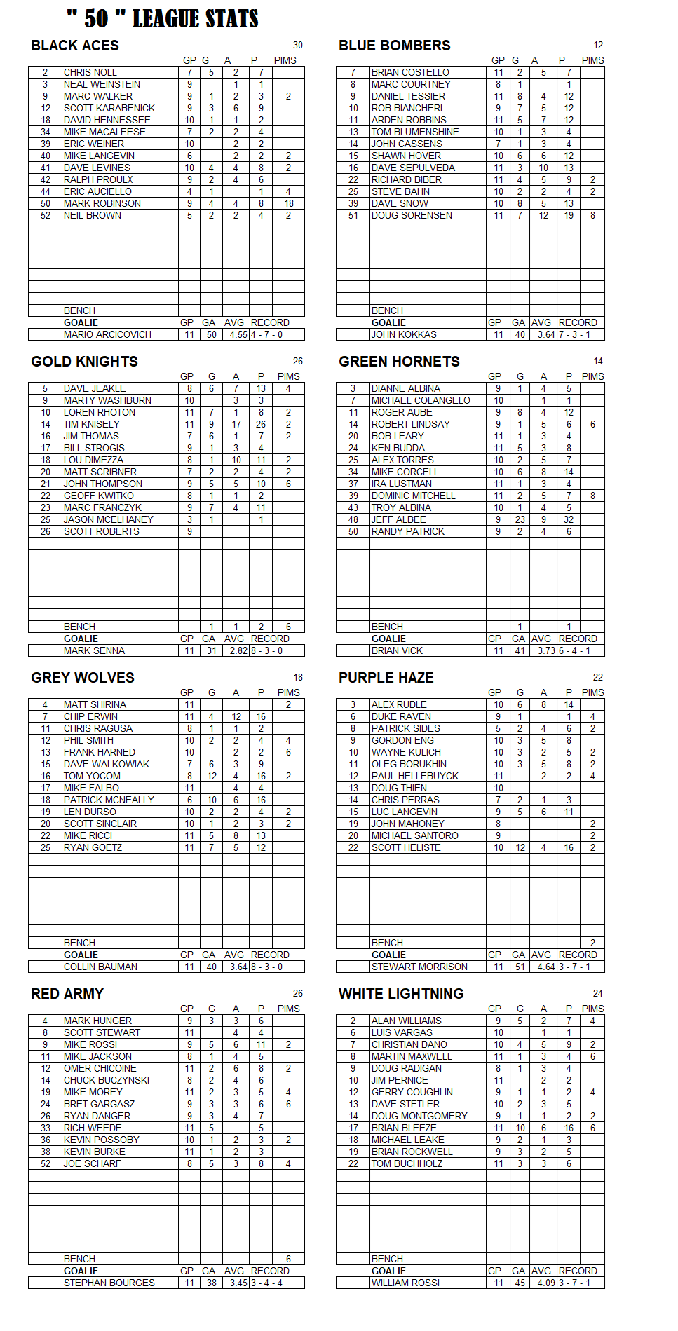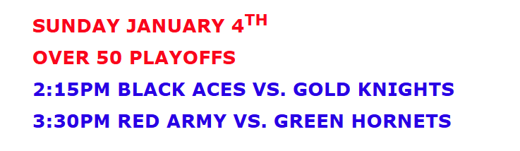 Over 50 League The Over 50 League consists of players of all skill levels. Games are played Sunday afternoons from 2:15pm to 4:45pm. For current schedule, standings, and statistics see below.