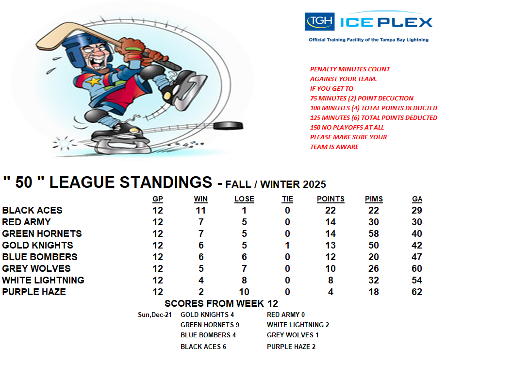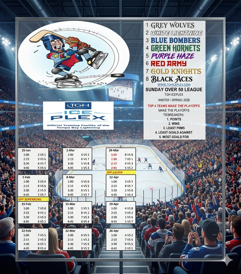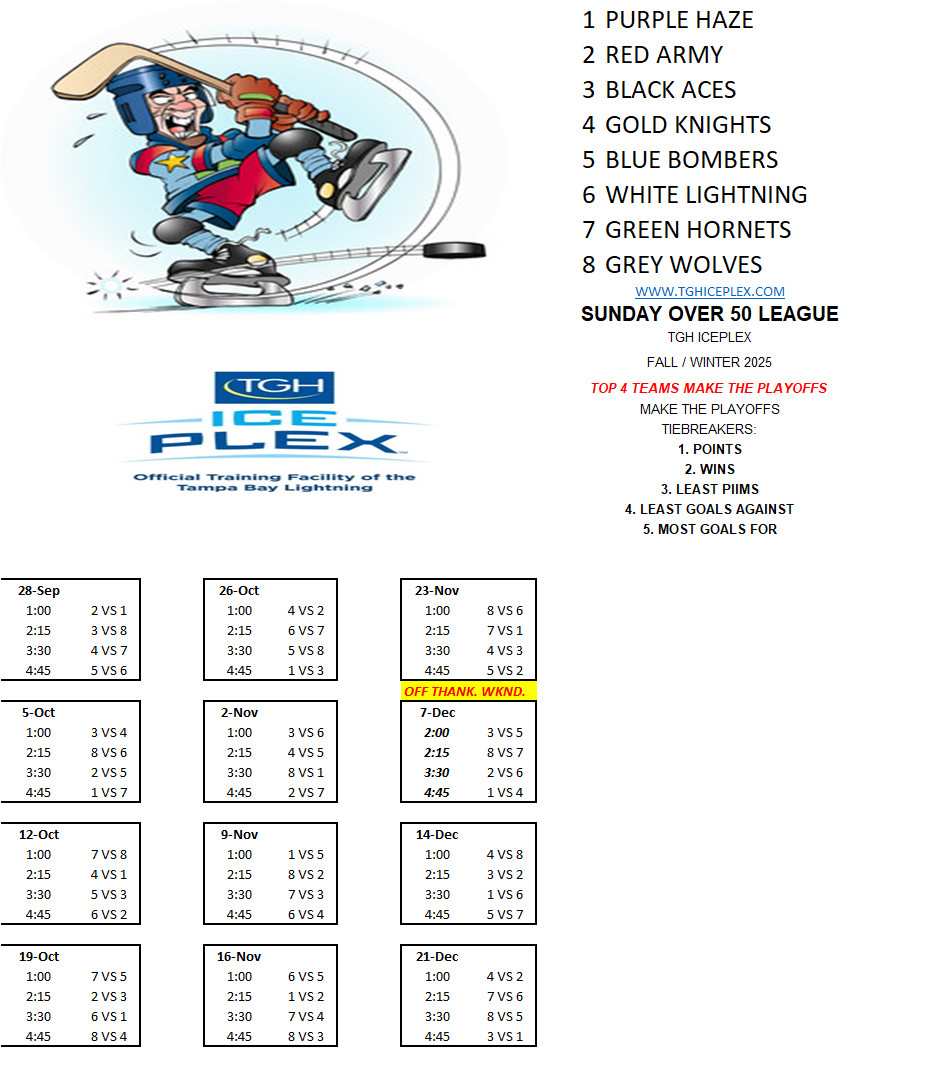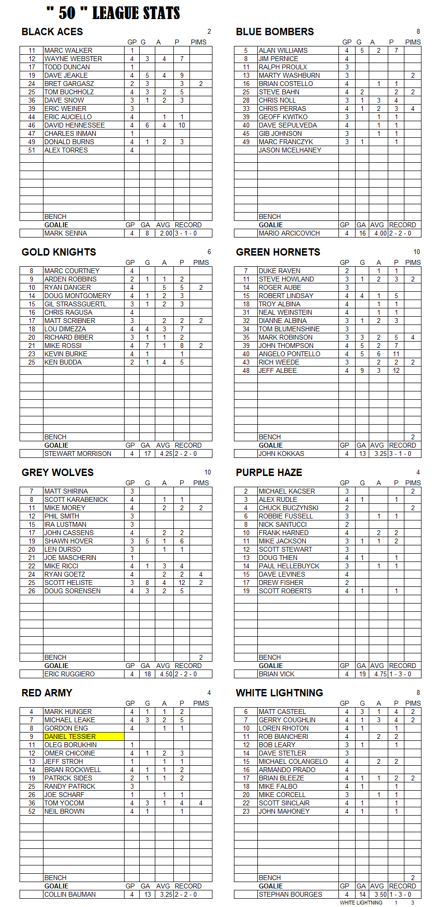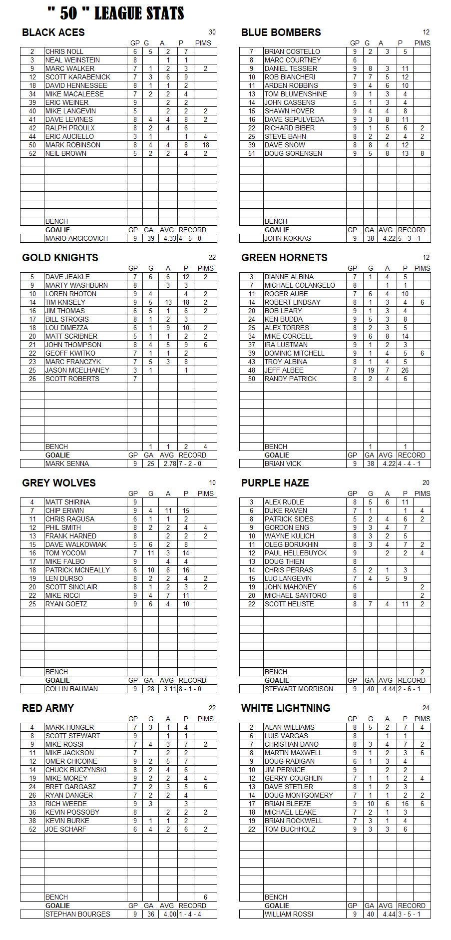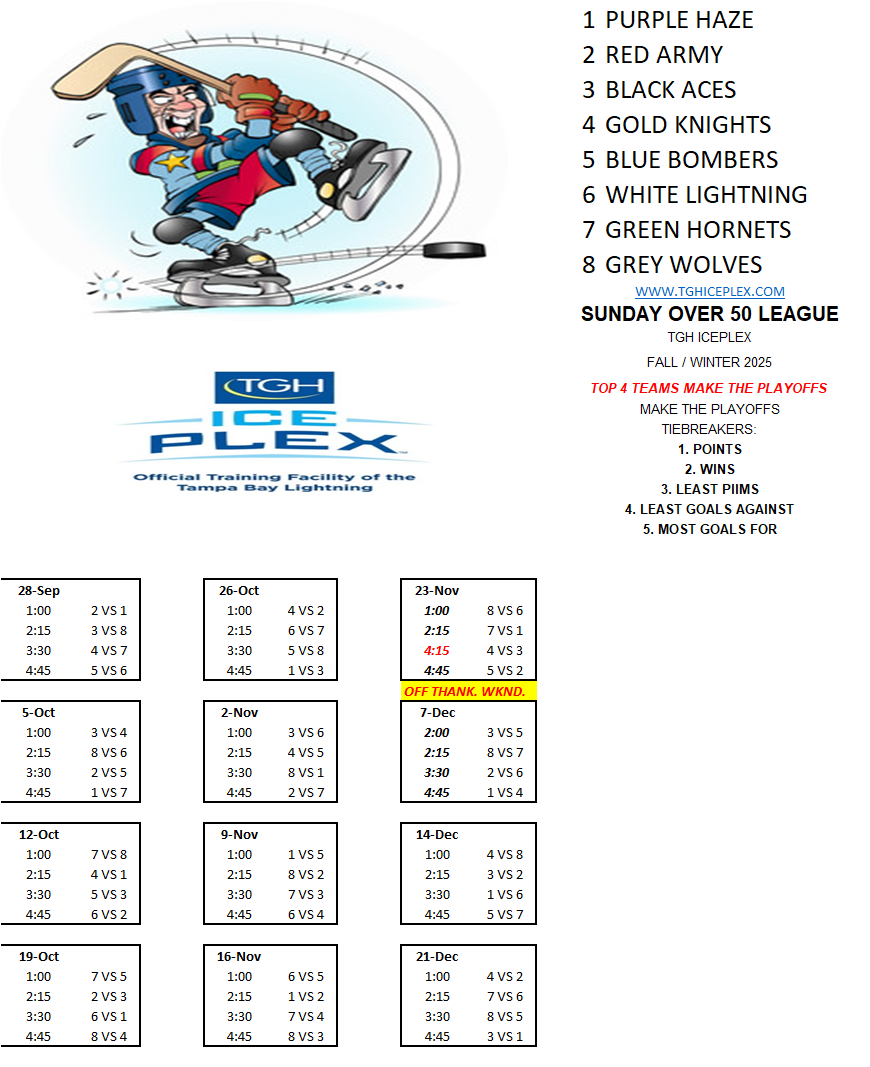Over 50 League The Over 50 League consists of players of all skill levels. Games are played Sunday afternoons from 2:15pm to 4:45pm. For current schedule, standings, and statistics see below.